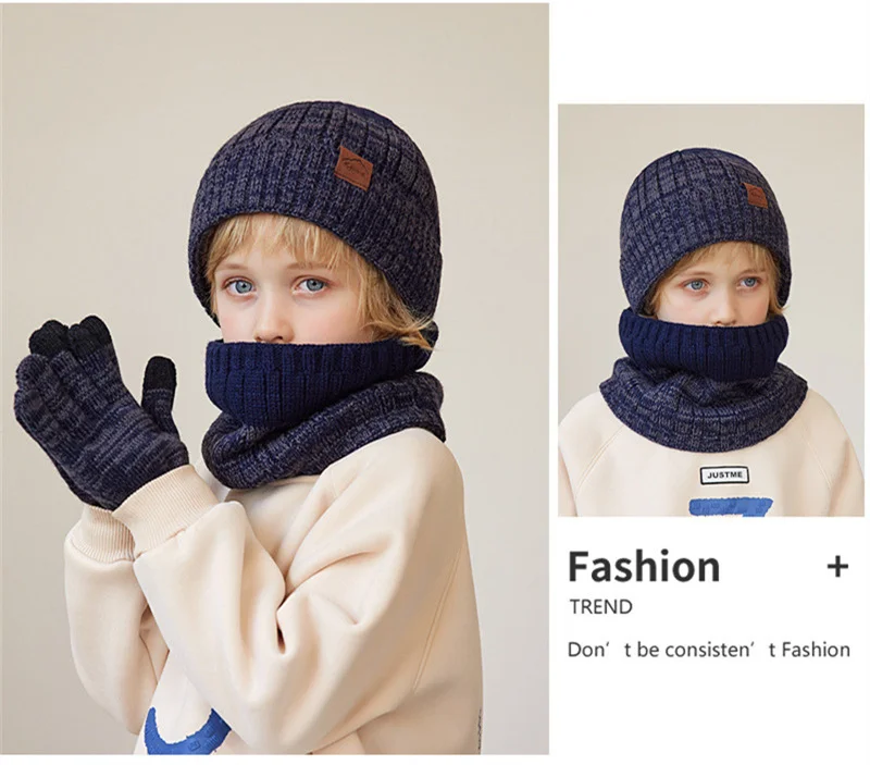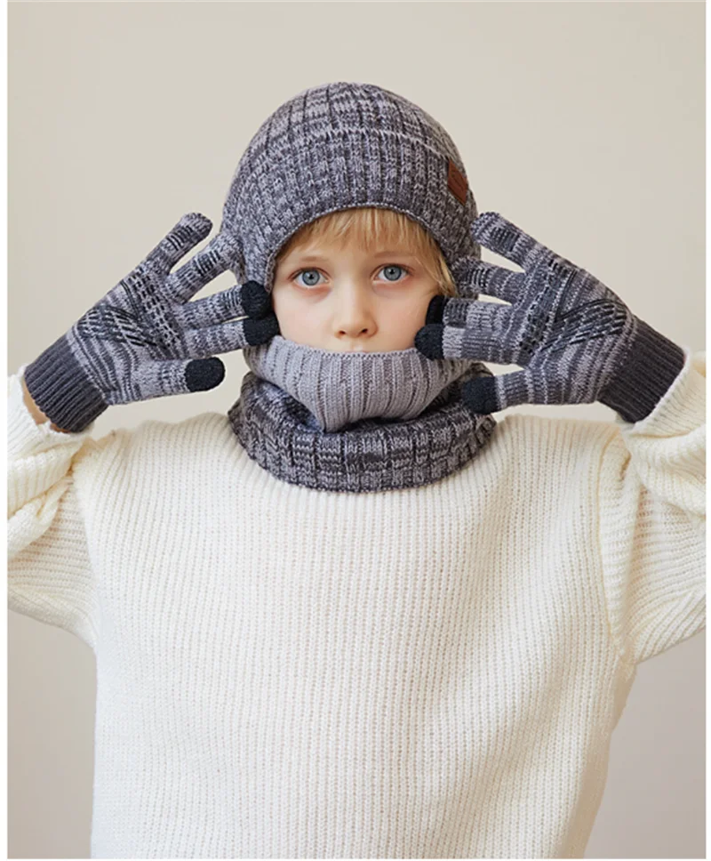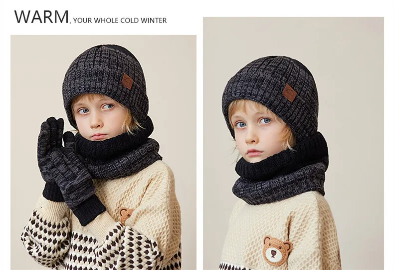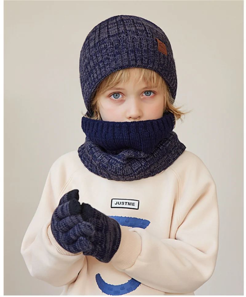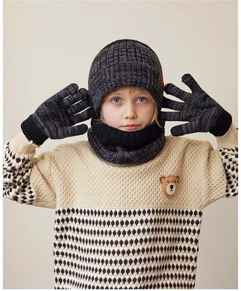 1 Set 4-10Y Children Baby Boy Winter Knit Gloves Hat Scarf 3pcs Suit Outdoor Windproof Fleece Warm Kids Ring Beanie Hat for Boys