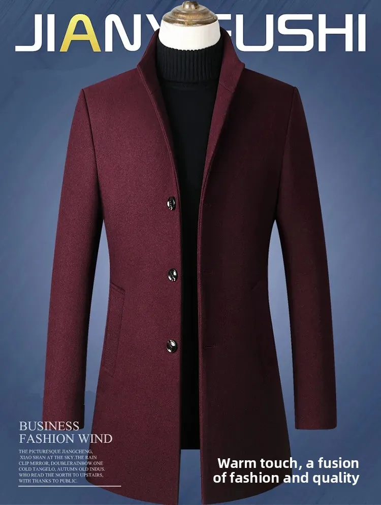 Autumn Winter Men's Woolen Coat Long Stand Collar Single Button Men's Jacket Loose Fit Chinese Brand Fashion Outerwear